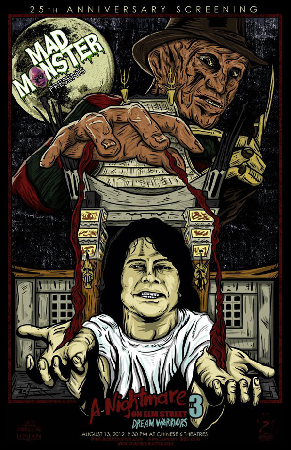 A pesar de que no nos gusta redundar en las variaciones que un póster ofrece a partir de una misma ilustración en los distintos países, ¿cómo podríamos resistirnos a poner el póster patrio? Misma ilustración, sí, pero con una peculiar reinvención del logo diseñado por Matthew. Y dejando sin traducir el subtítulo Dream Warriors, misteriosamente. Ahí va:
